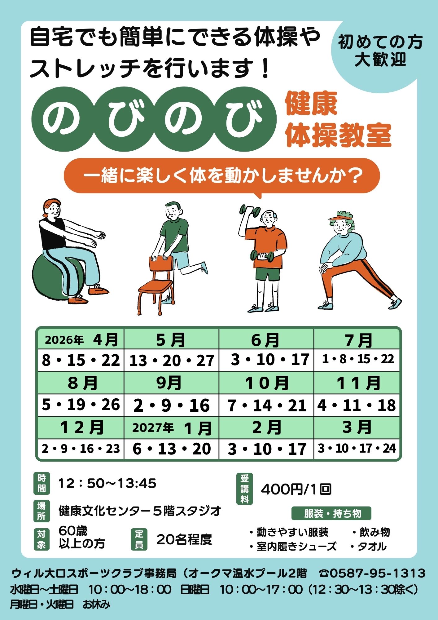 のびのび健康体操教室 のびのび健康体操教室 足腰の衰えは「動かさないことにより体がなまってくる」ことからはじまります。自宅でも簡単に出来る体操やストレッチなどを行う教室です。 日程 水曜日(月3回or4回) 12:50 ~ 13:45 会場 大口町健康文化センター5階 対象 60歳以上の方 参加費 1回400円